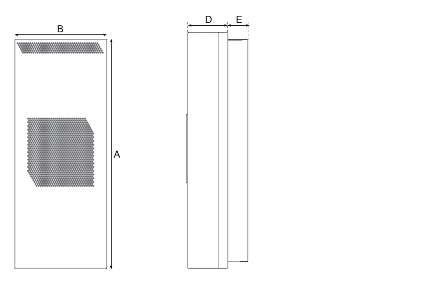 Cabinet air circuit: 385 / 550 m³/hOperating Temperature Range 10°C - 55°C Mounting Recessed Dimensions A x B x C (D+E) A = Height | B = Width | C = Depth