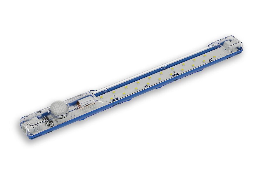 Art. Nr. Krones 0906630183 Numero di ordine 400900IR Produttore STRIPLITE Colore Parte superiore trasparente / parte inferiore blu Materiale della custodia Plastica PC Classe di protezione IP (EN 60 529) IP 20 Incluso Bewegungsmelder Nota Class II